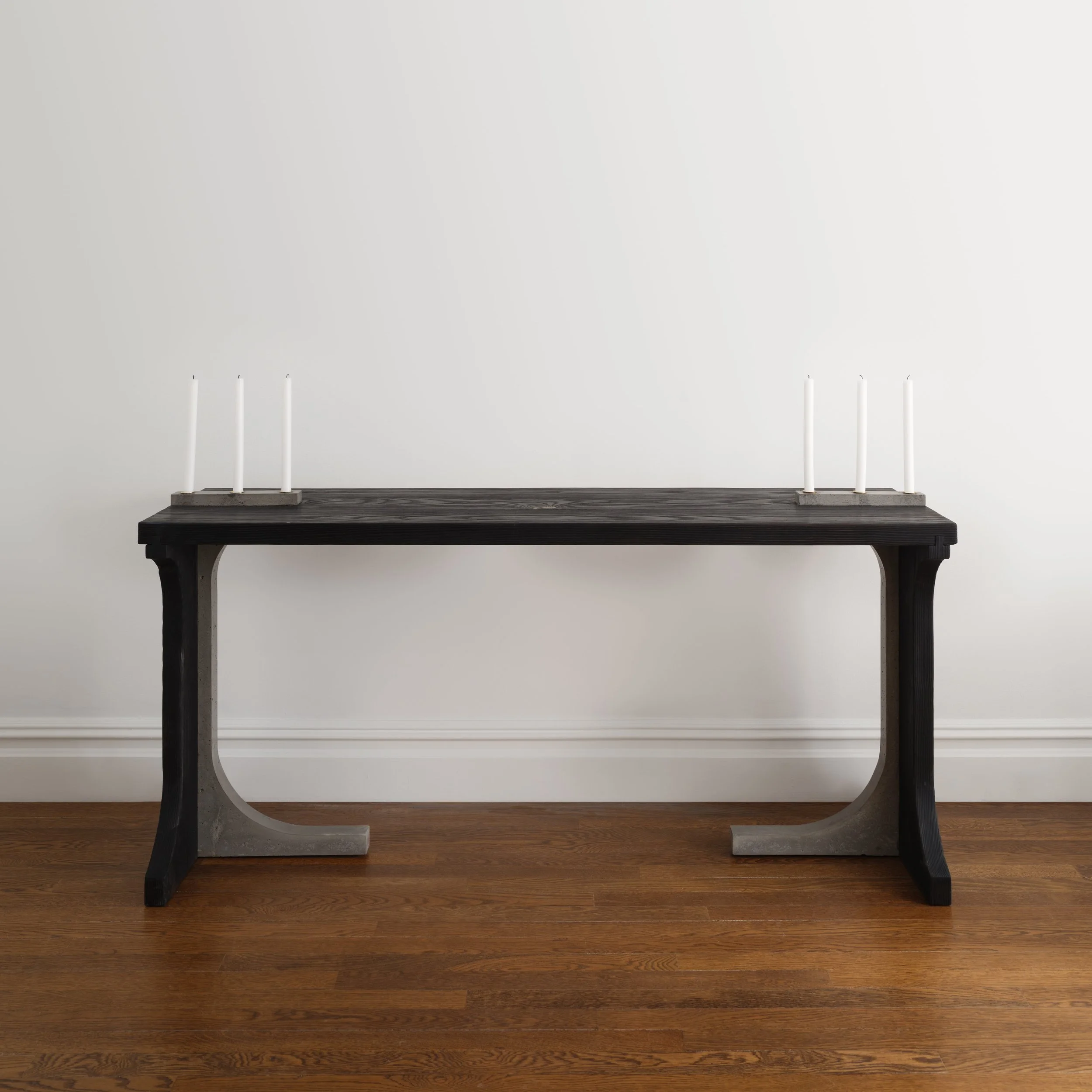 High Altar Boy is conceived as a domestic altar. A tall foyer table holds six brass candle holders set into a structure of cast concrete and burned ash. The wood is treated using shou sugi ban, leaving its surface darkened and marked by heat. The piece balances mass and restraint, translating a repeated gesture of care into a functional object scaled for the home.